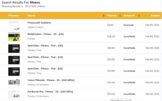 Say you want to take part in an affiliate program in the fitness niche… Simply type “fitness” into the search bar to see a list of available offers. You can filter these by price, network, or even “date added” to find the best offer for you.